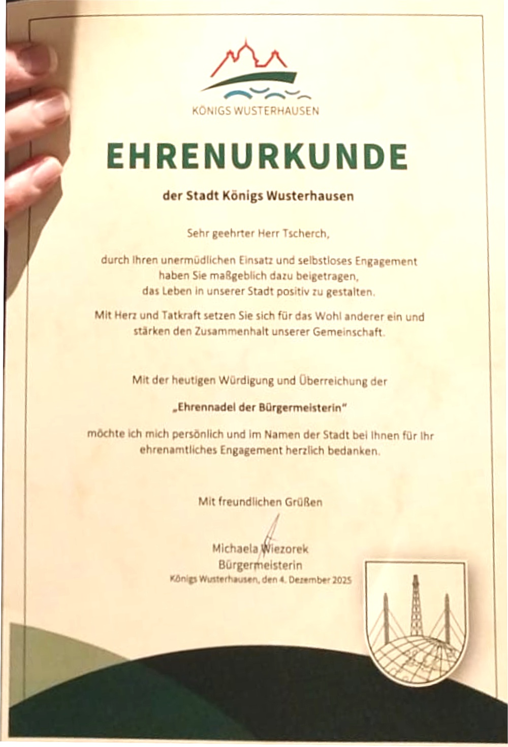 Ehrennadel der Bürgermeisterin für Andreas Tscherch